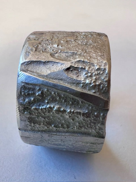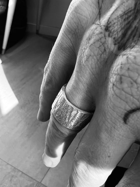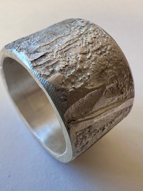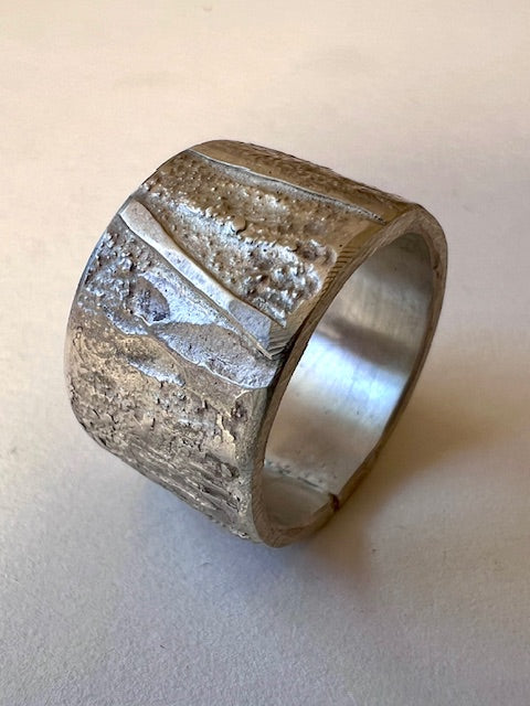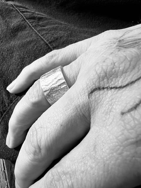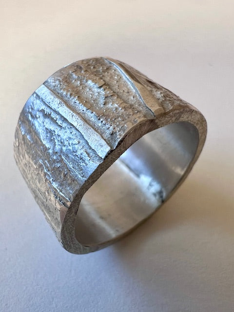 Hand-forged solid silver ring band, heavily textured with a tree-bark-like finish