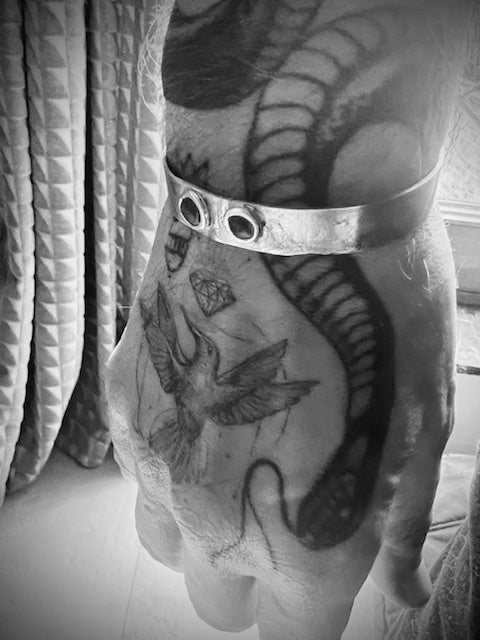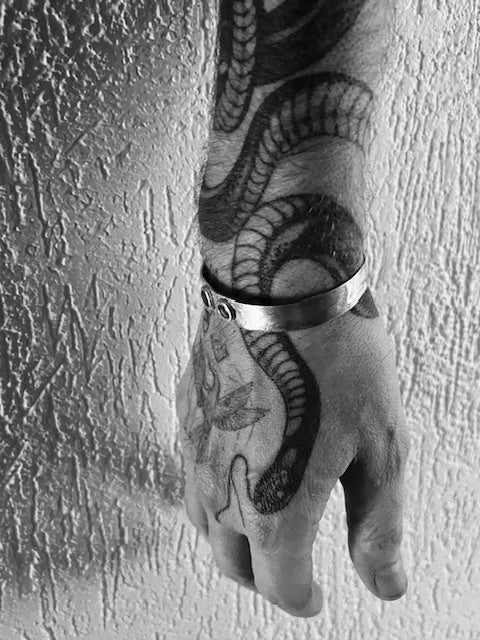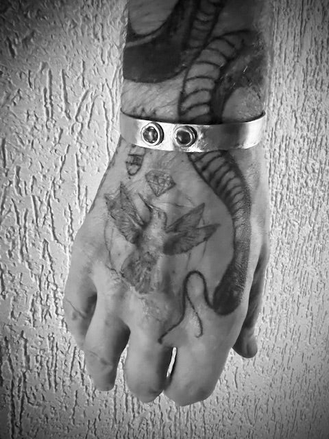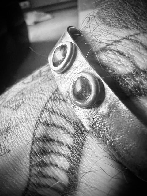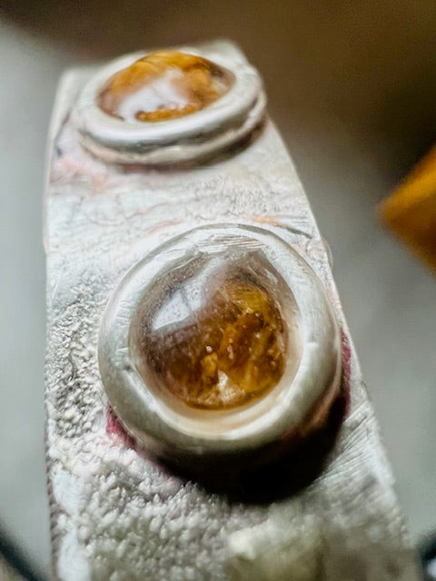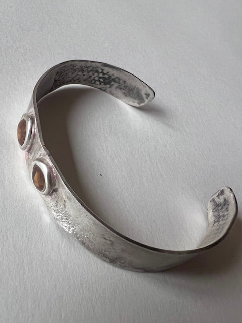 Hand-forged solid silver bracelet, heavily textured, featuring hand-forged ornaments set with tiger eye shards on top.