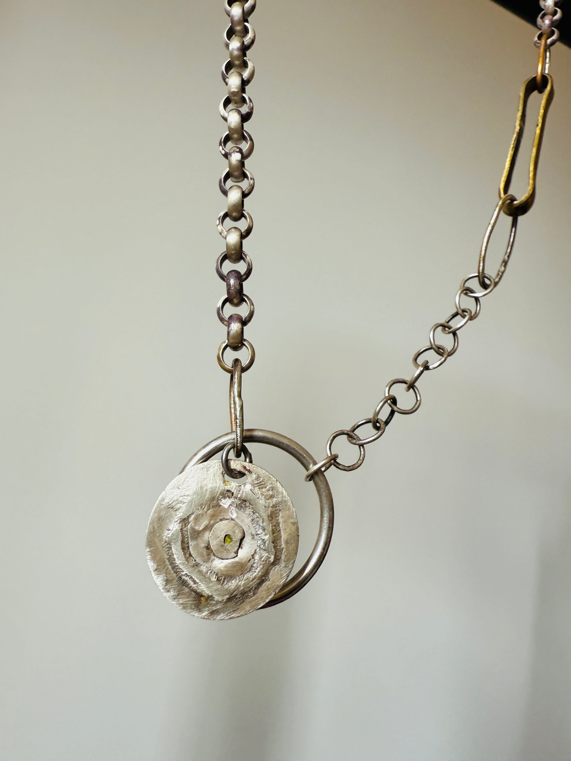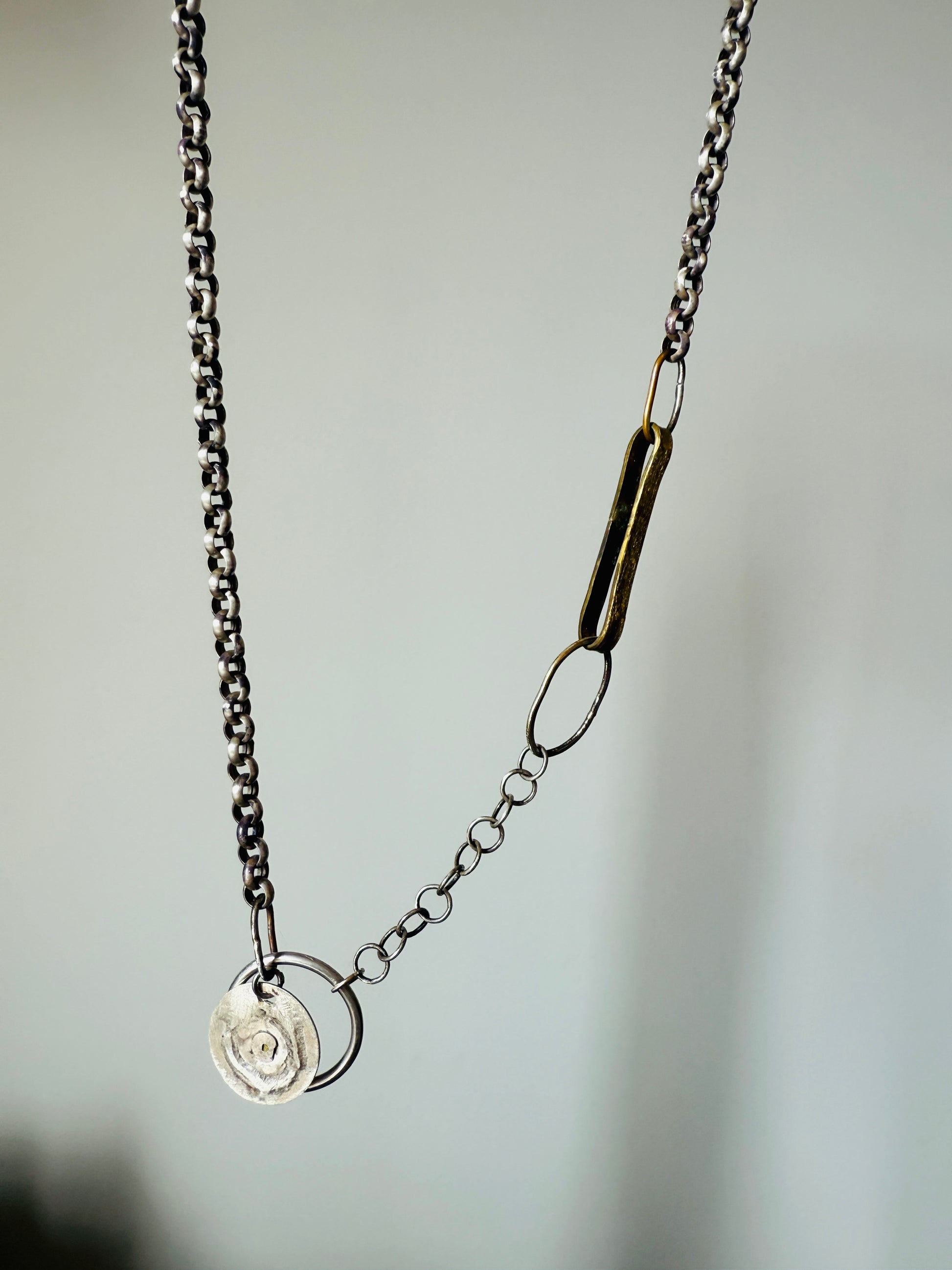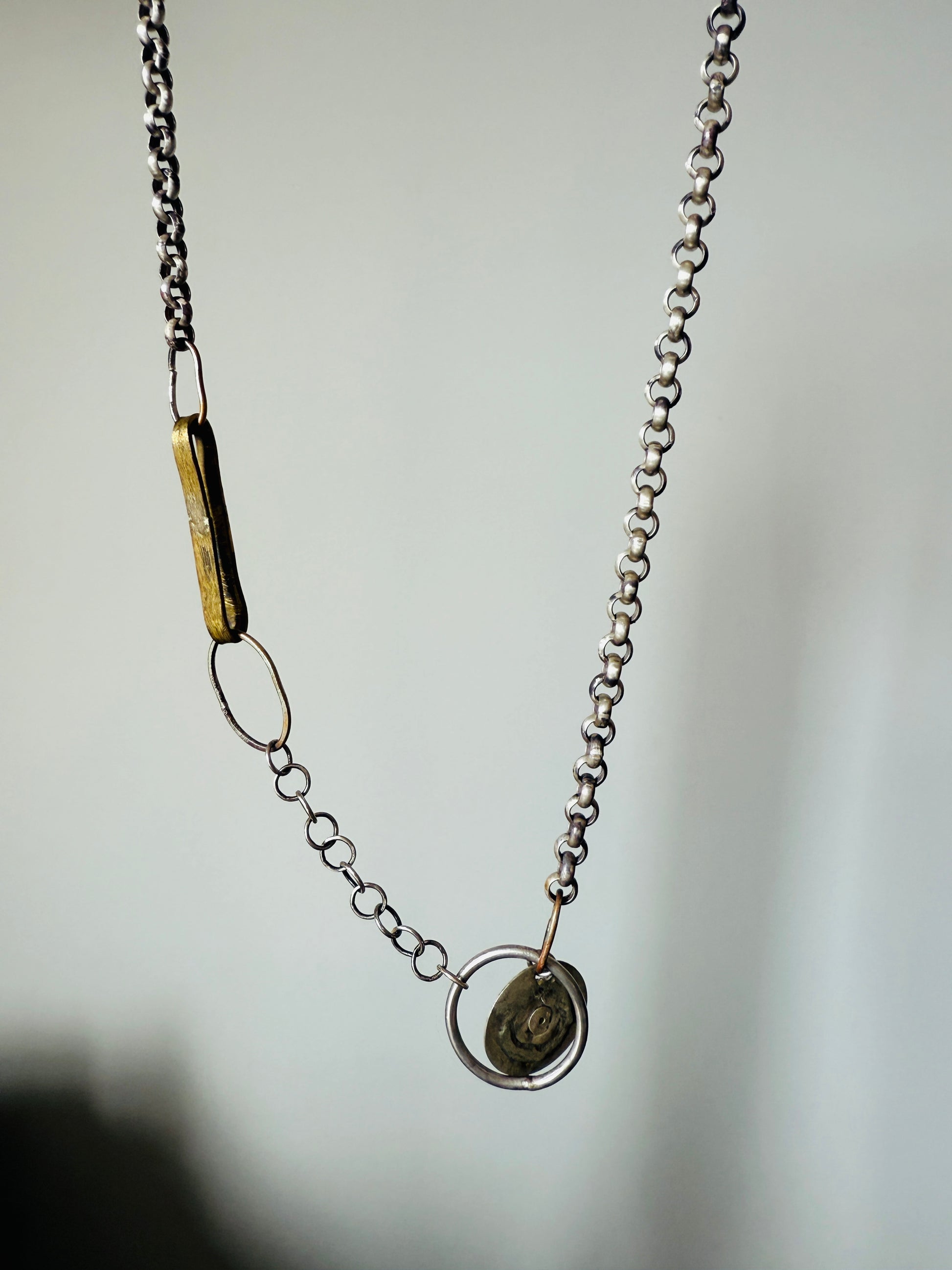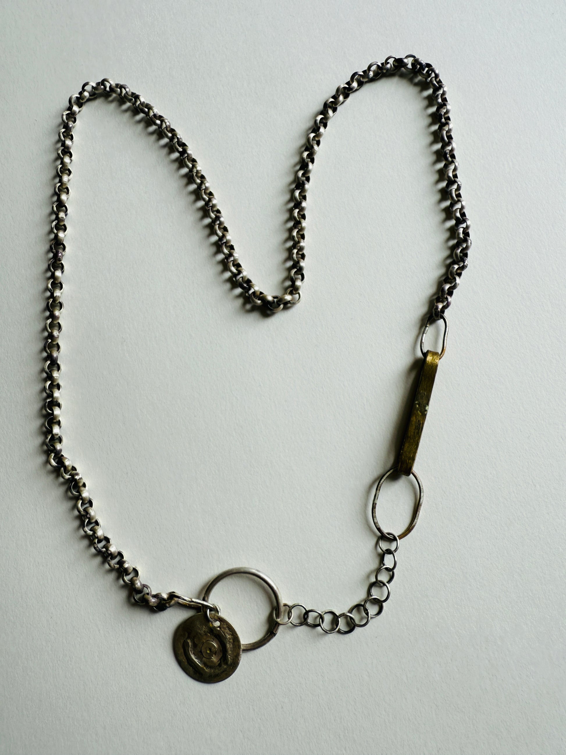 Solid silver necklace with hand-forged silver and brass shackles and charms.