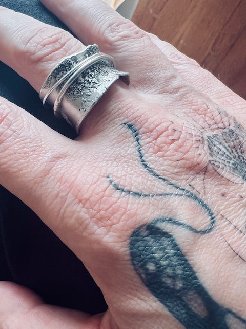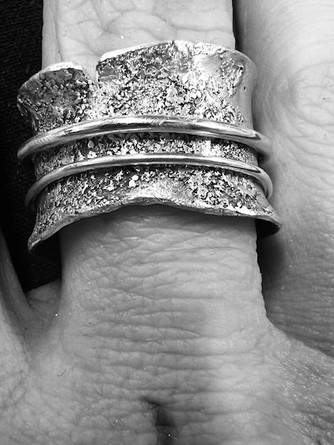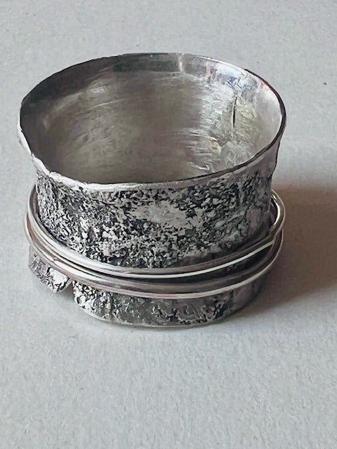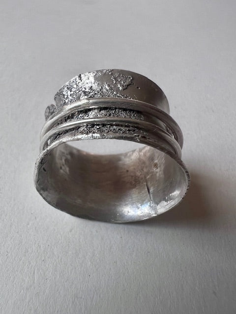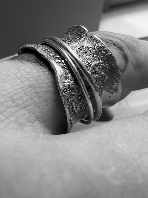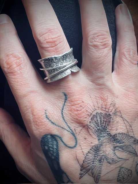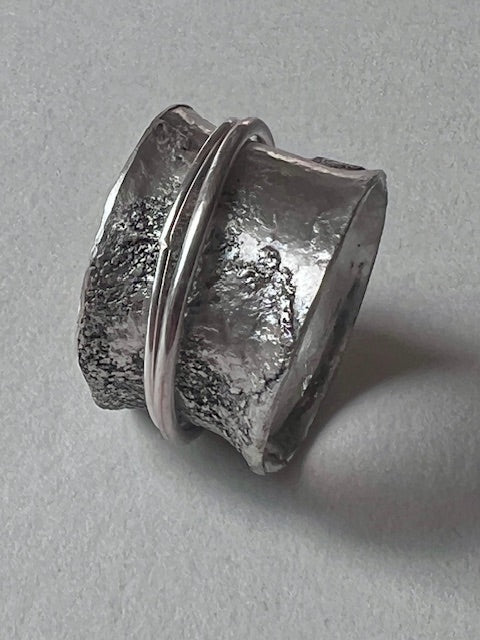 A wide, rough and tumble solid silver ringband with two thin, loose sitting wires orbiting its surface.