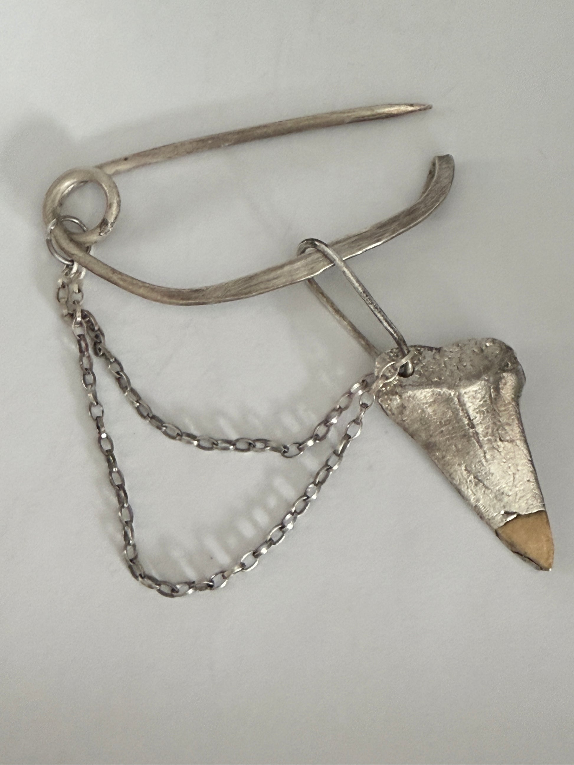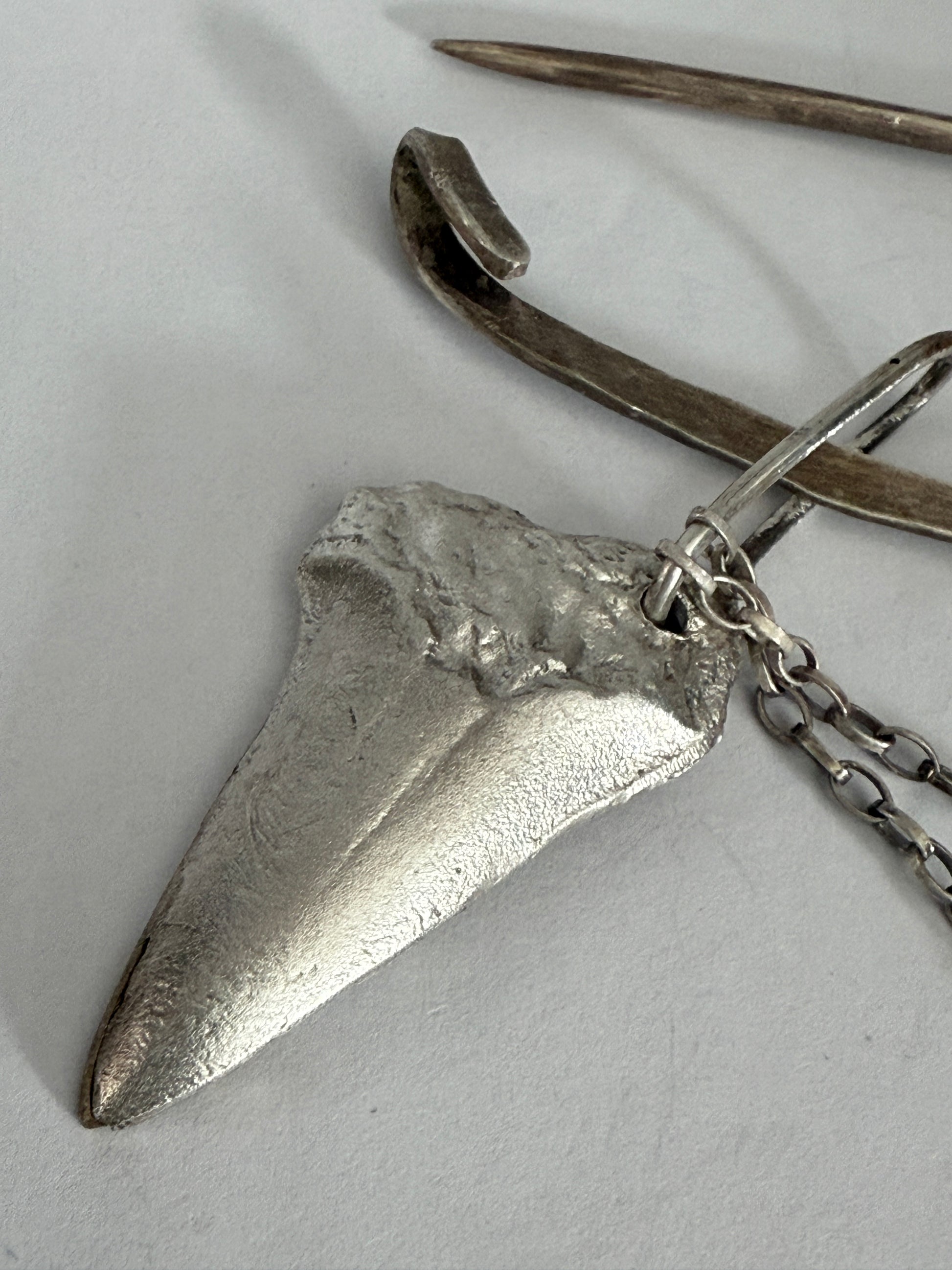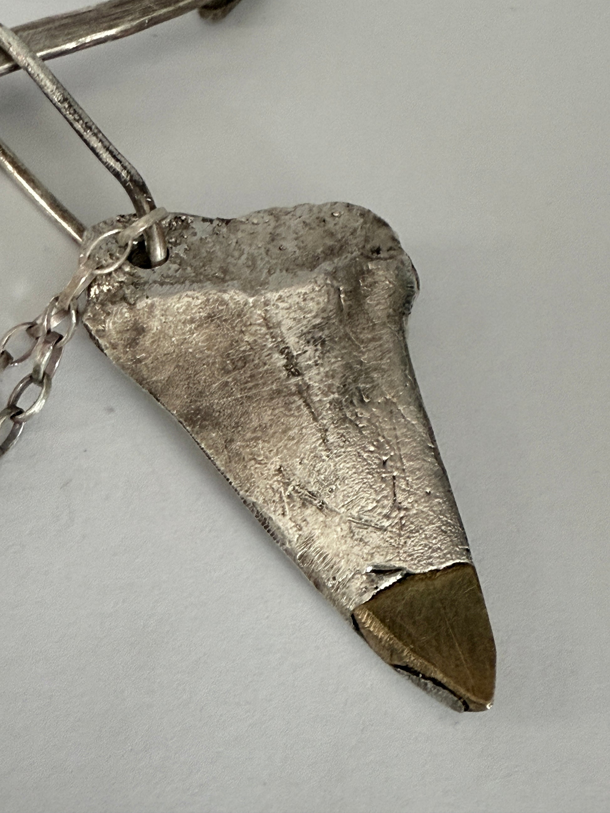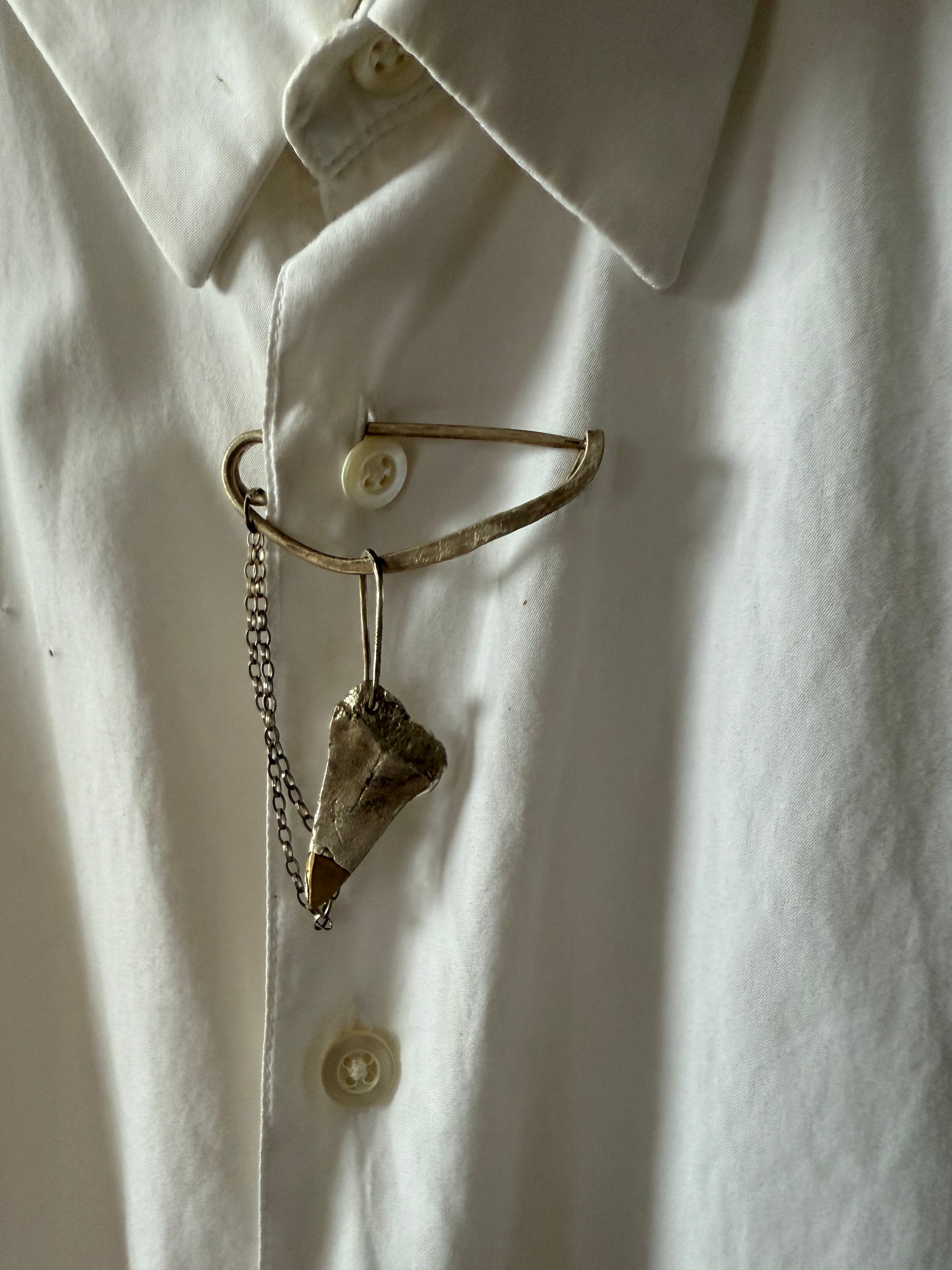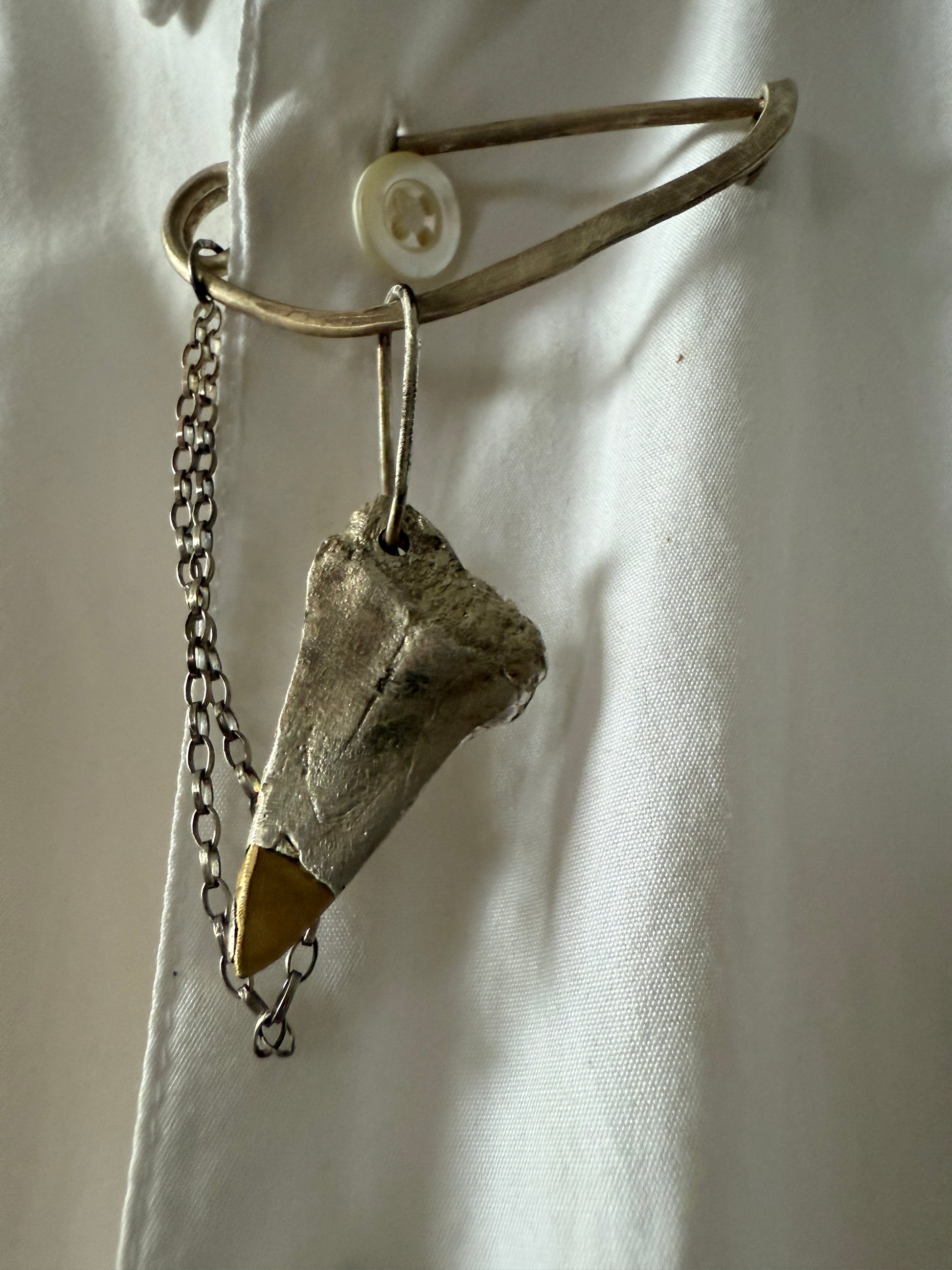 Custom-made silver brooch with a silver and brass shark tooth, cast from a real one found on the banks of the Scheldt.