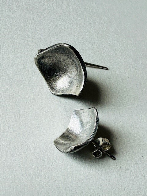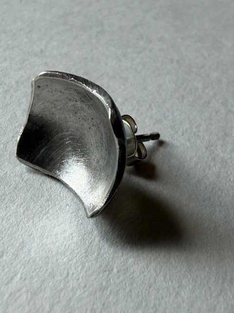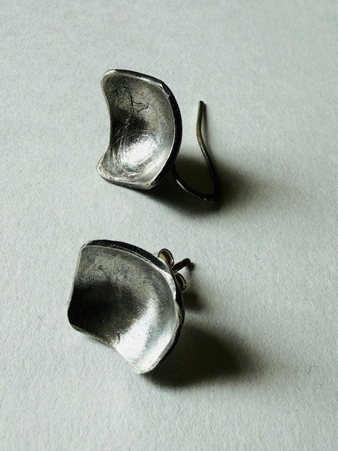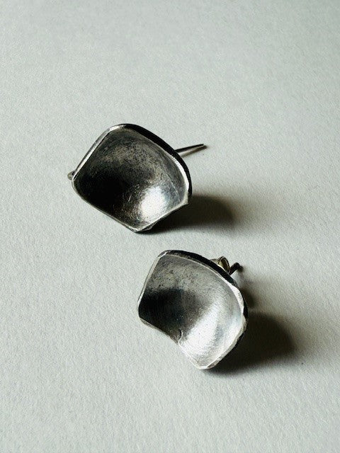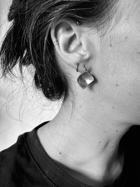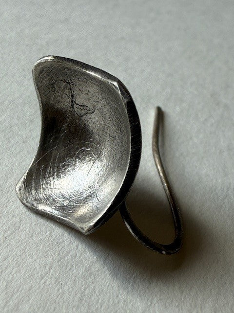 A pair of hand-forged silver earrings, orbiting just slightly out of sync.