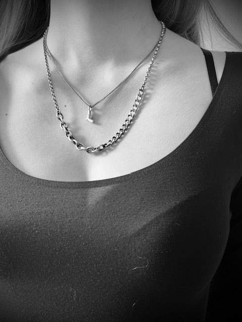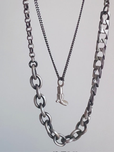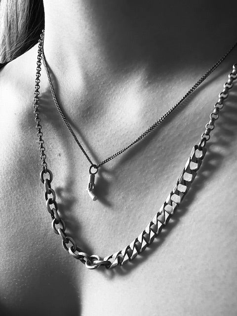 A claycast silver raygun-pendant, paired with a second chain with fragmented shackles.