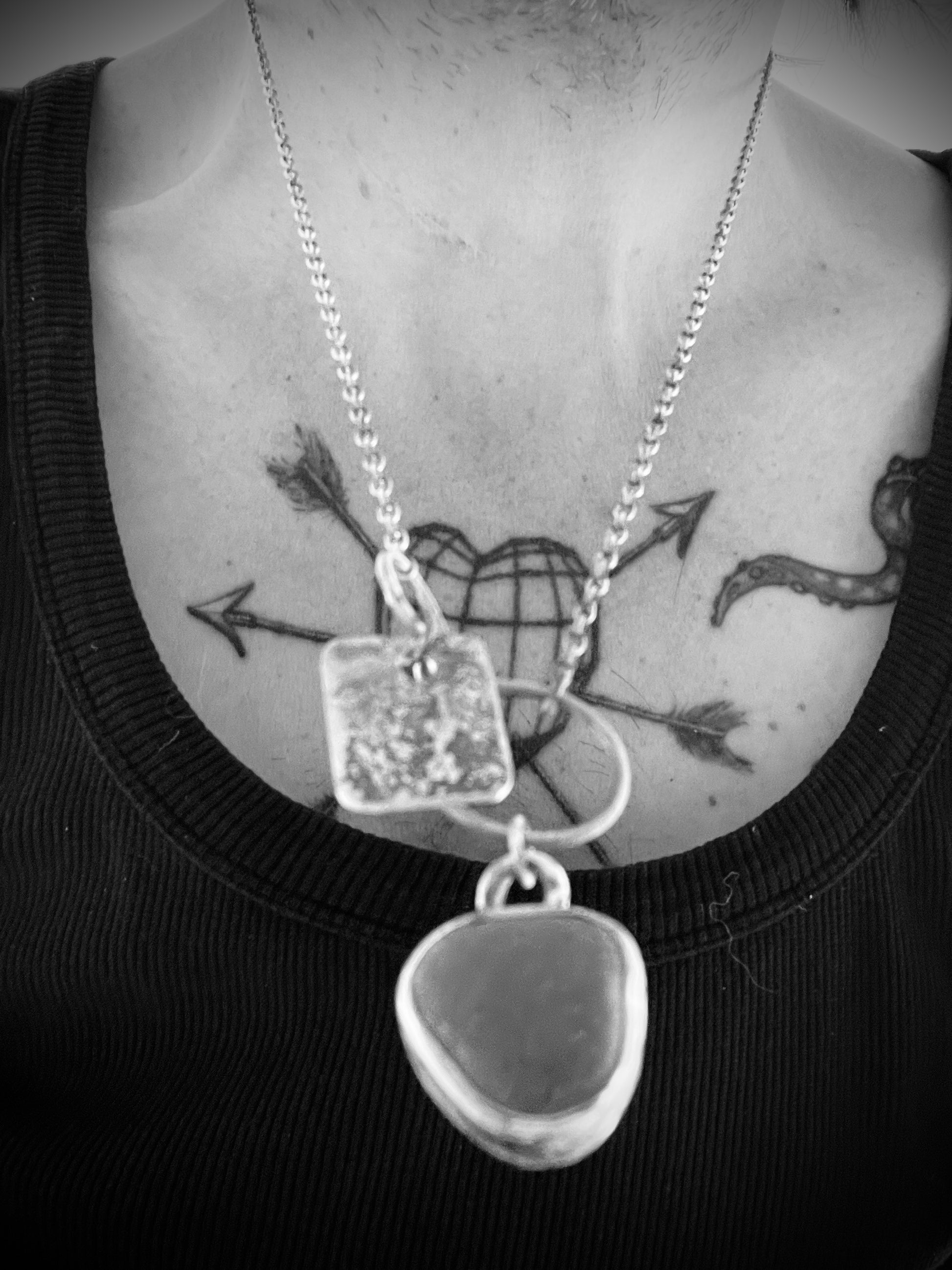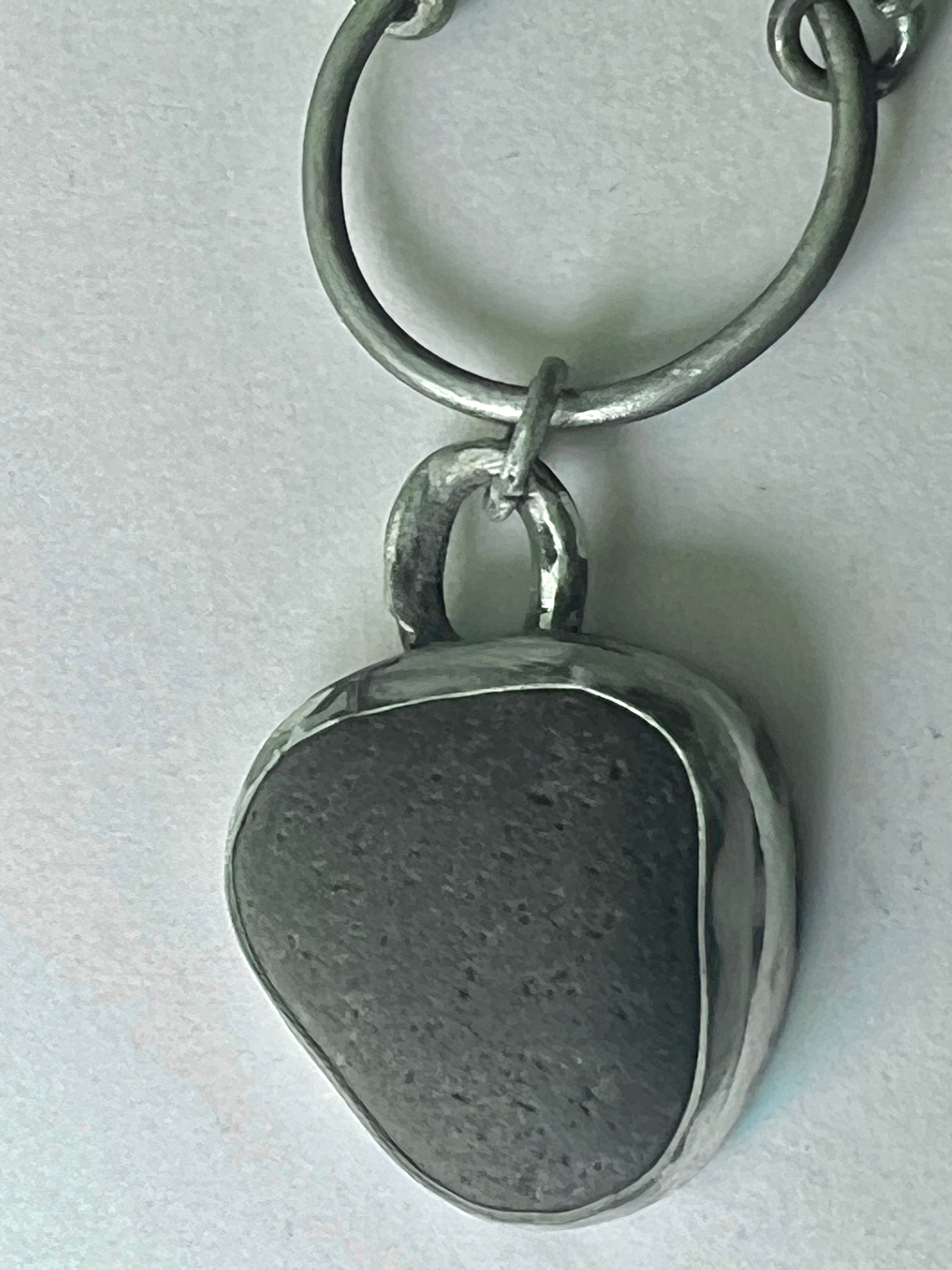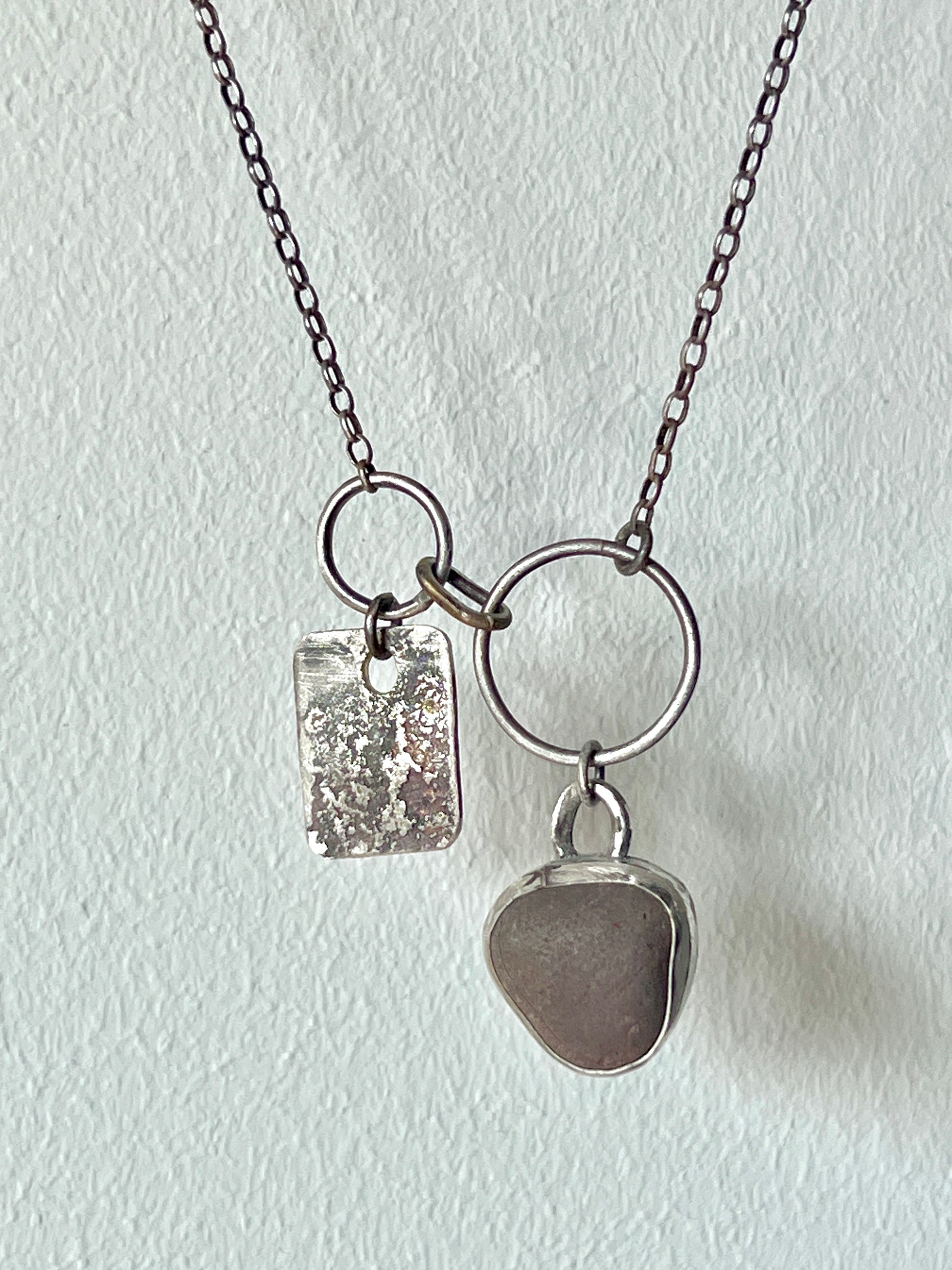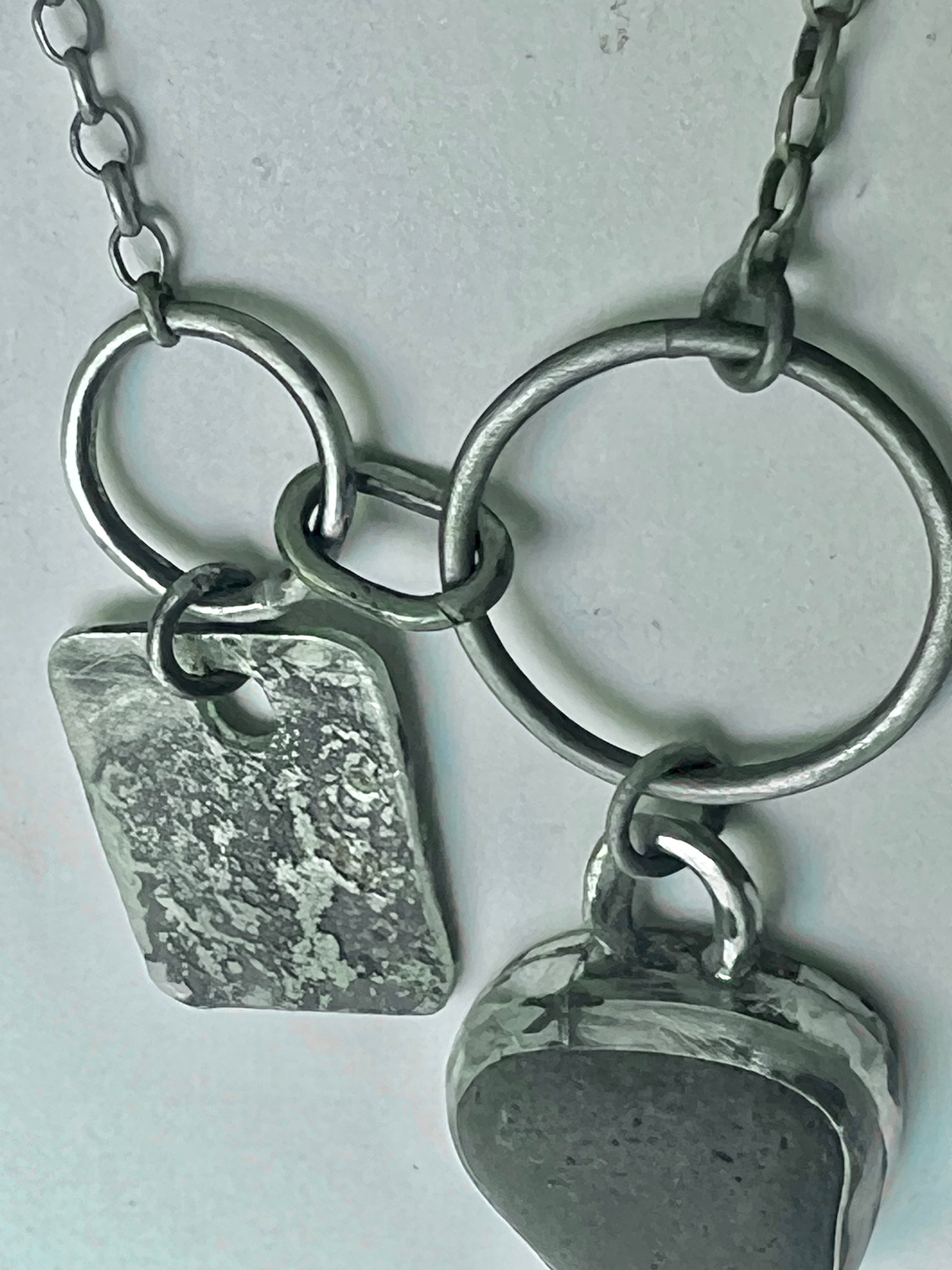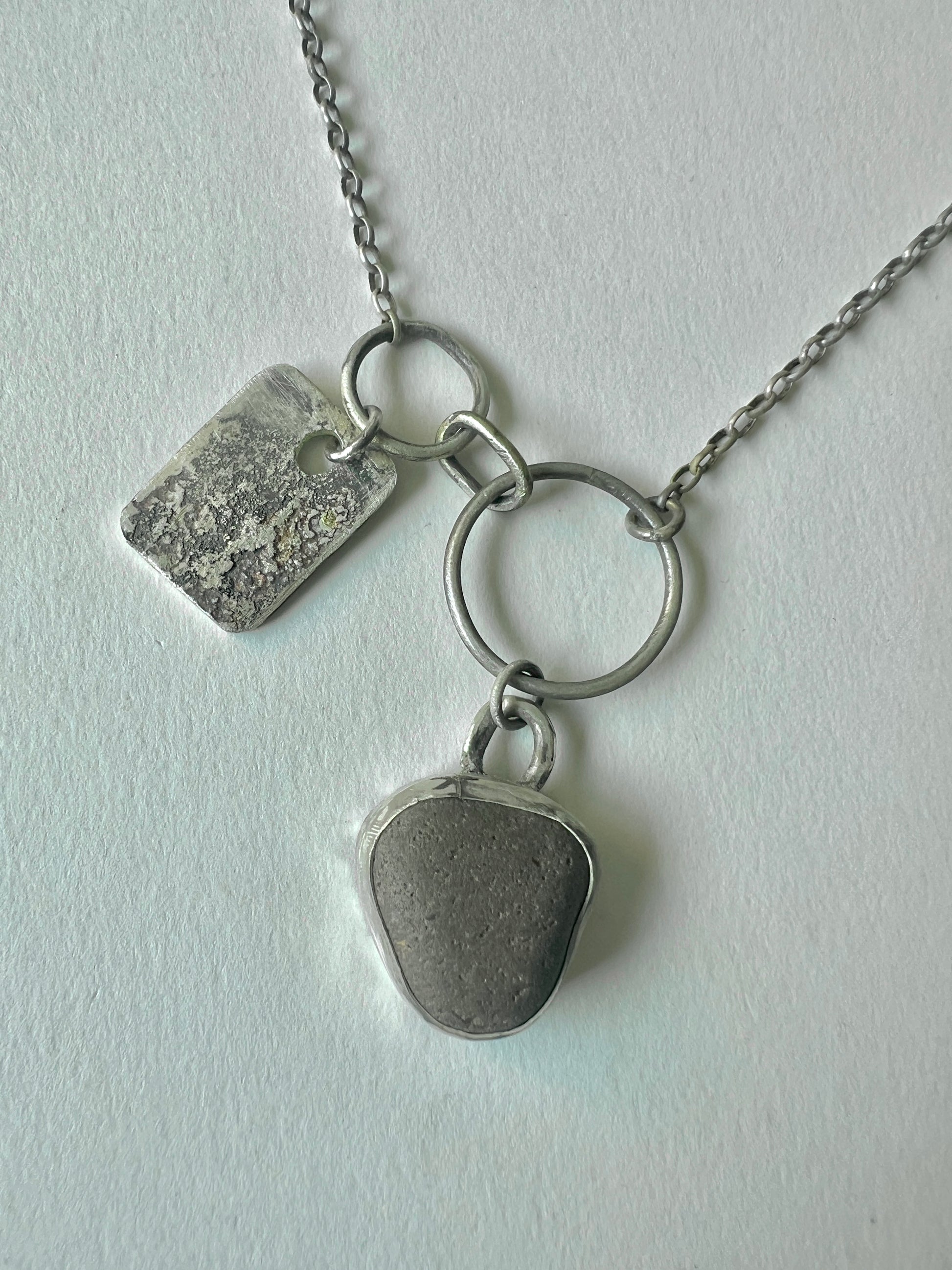 Solid silver, hand-forged necklace, with a heavily textured dogtag-pendant and a pebble-pendant.