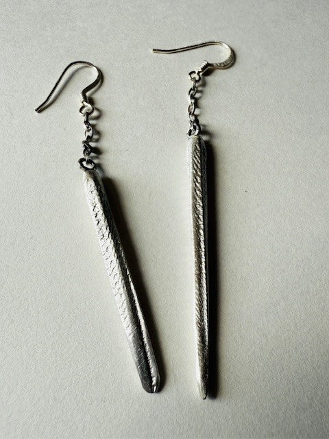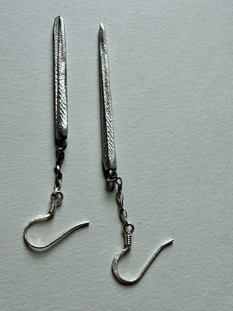 A pair of solid silver earrings, cast in sepia, with raw texture and attitude.