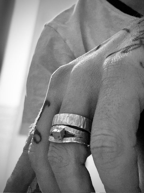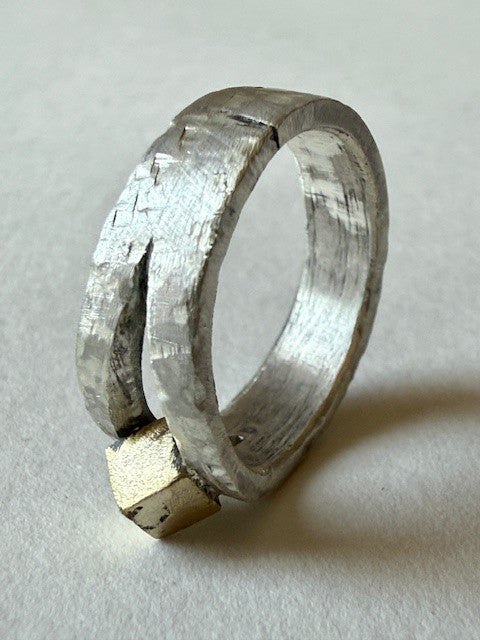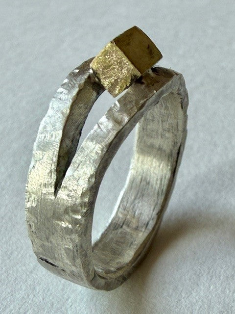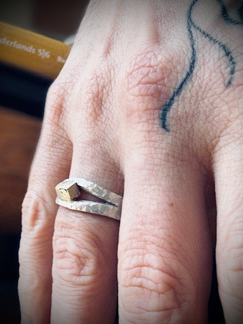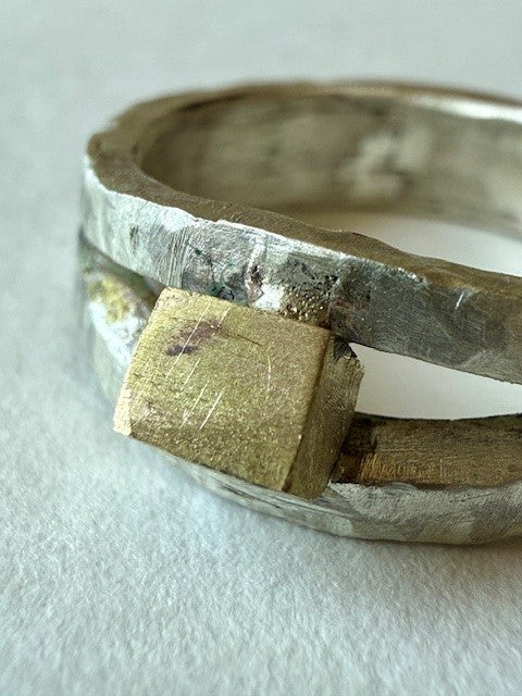 Hand-forged solid silver ringband, split in half with a little brass cube.