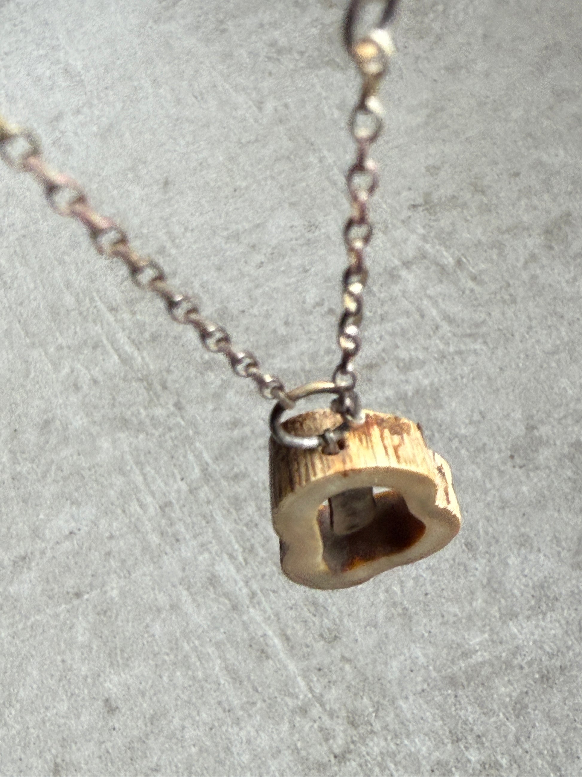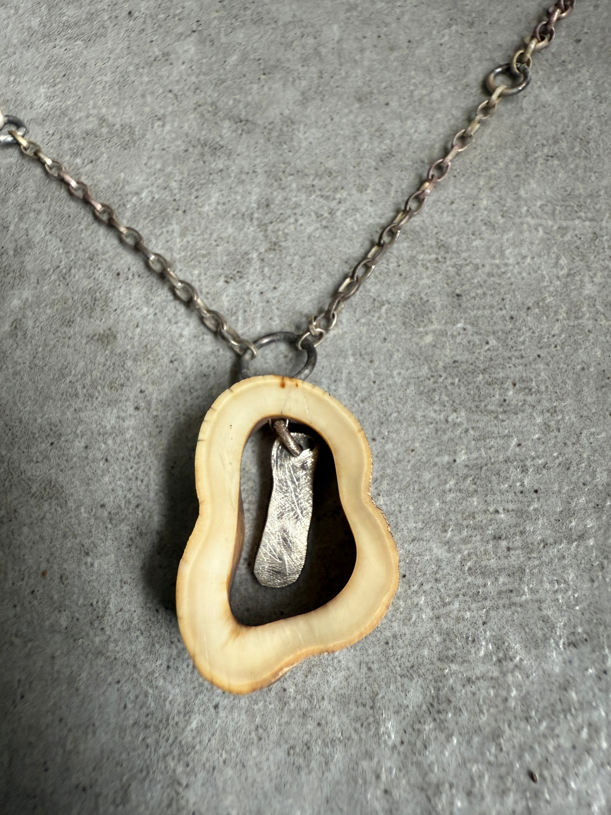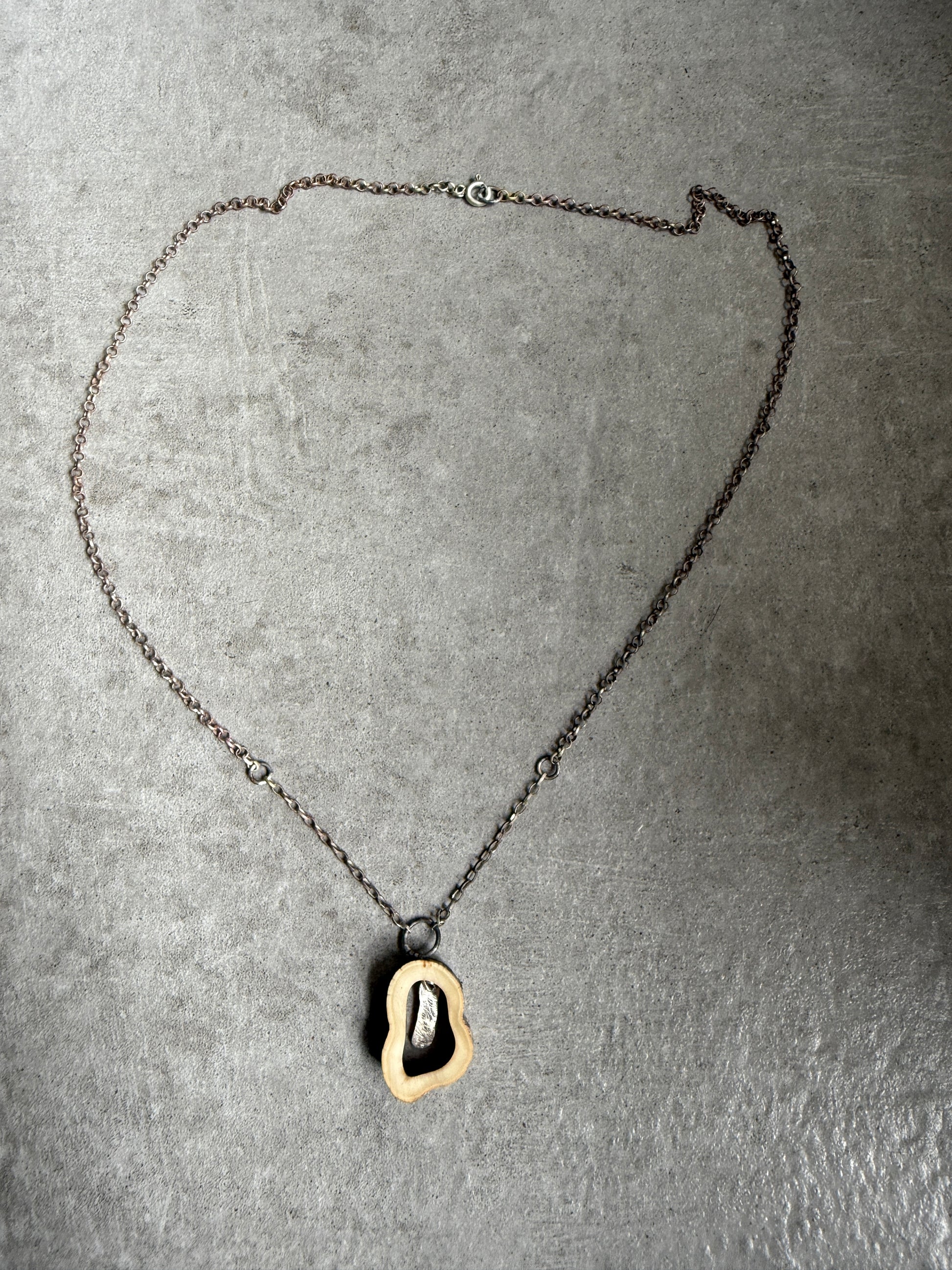 Silver chain necklace with a pendant with warthog tooth, sealed inside a hand-forged silver charm.