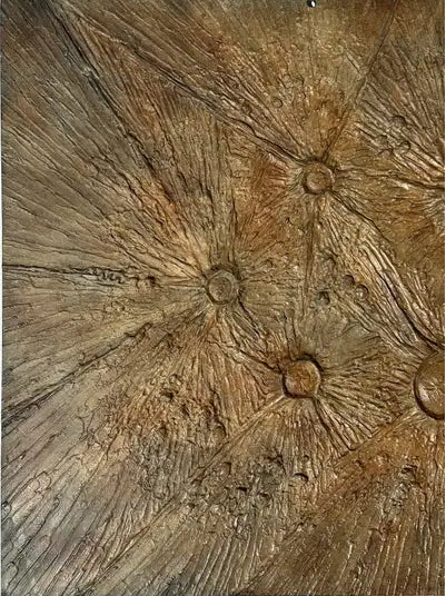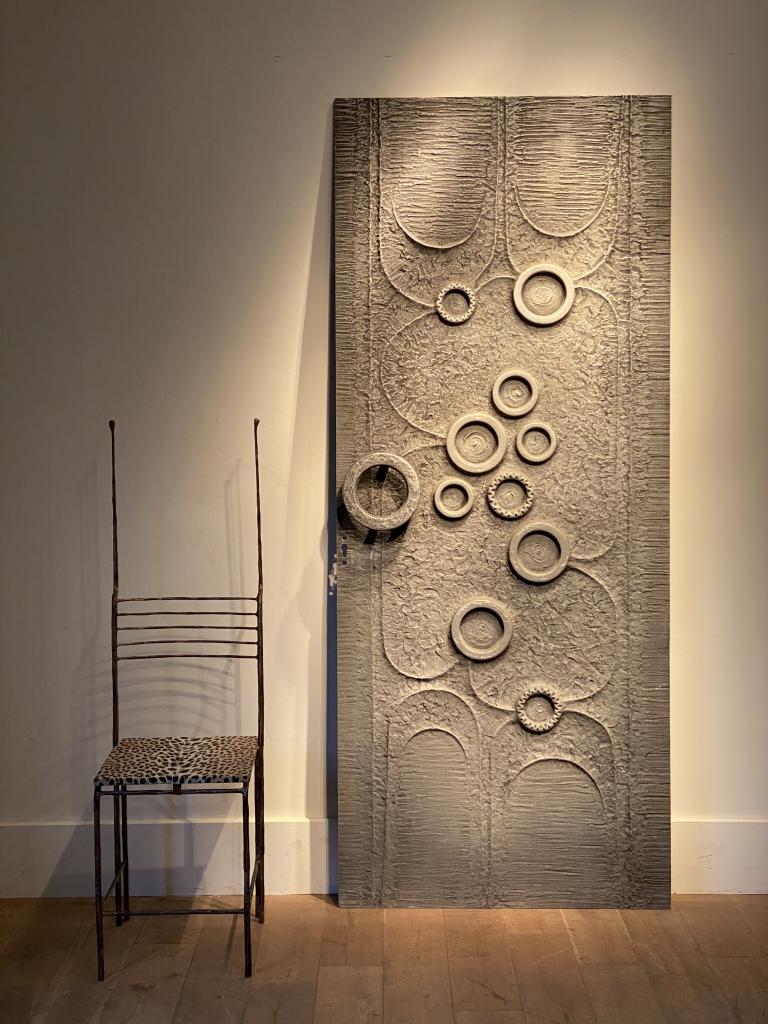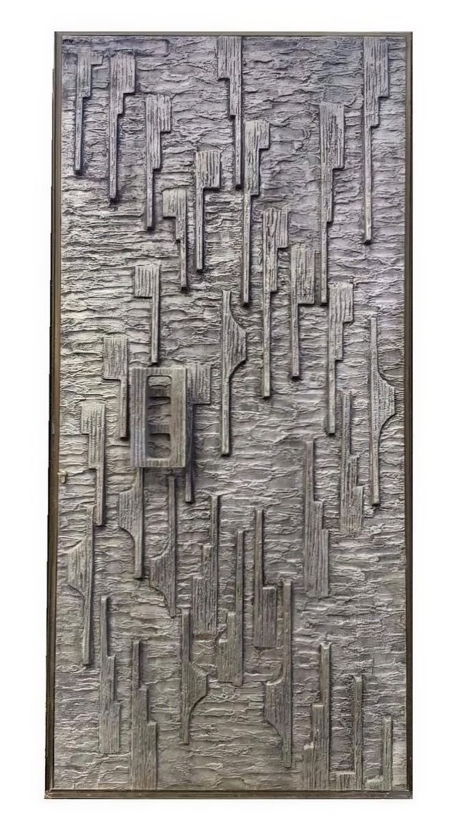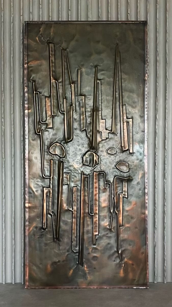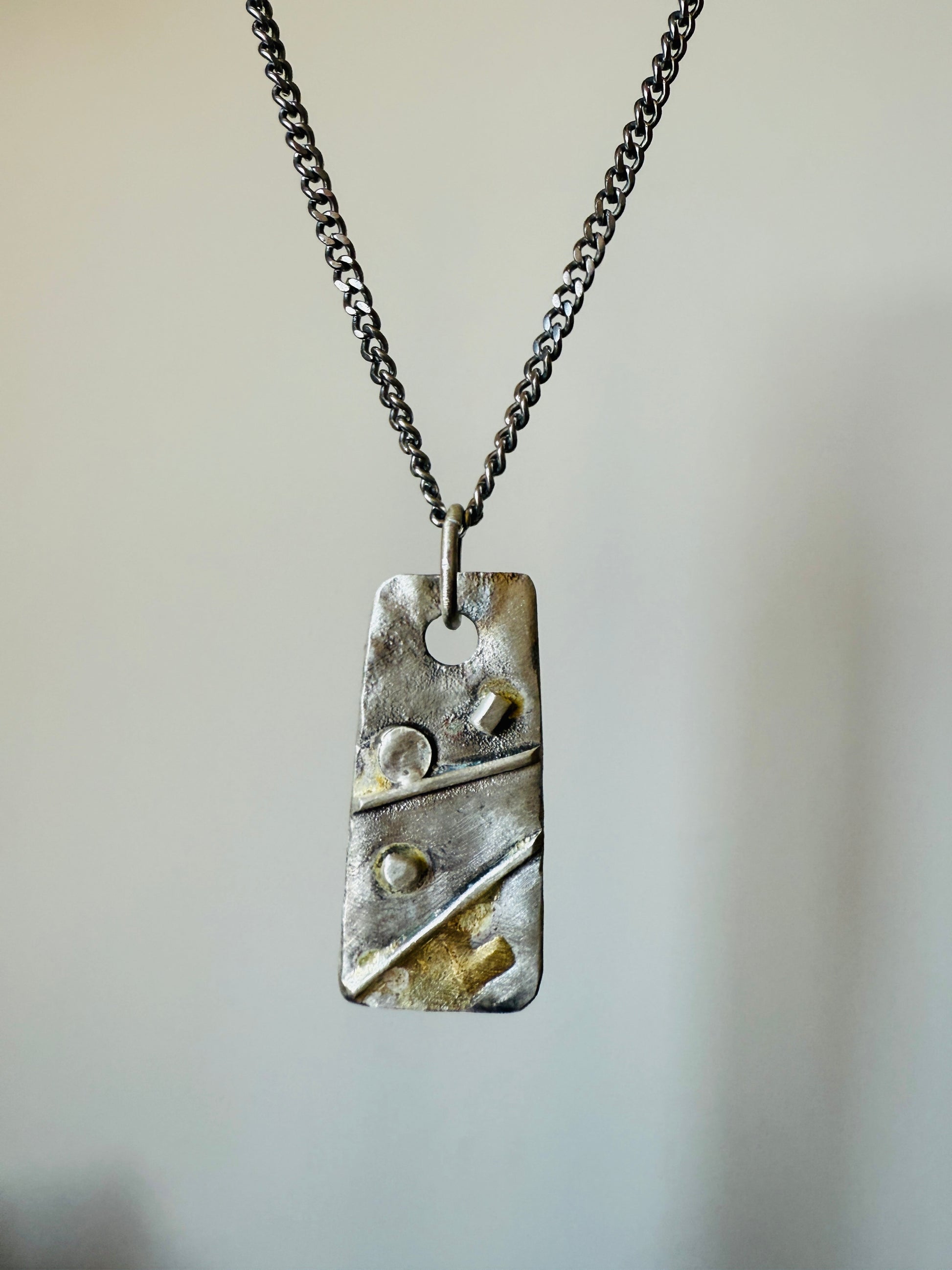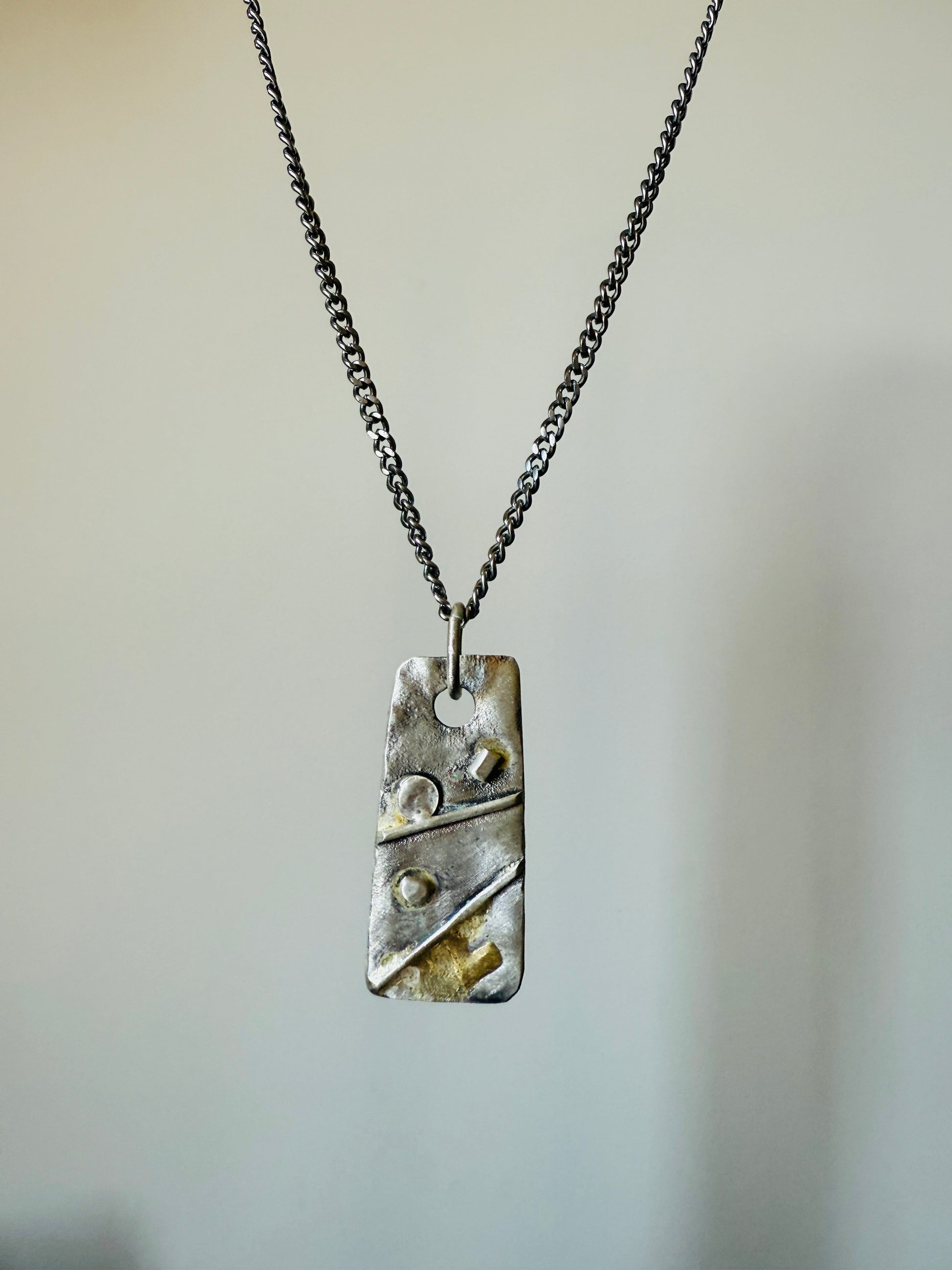 Silver pendant with a dash of brass, inspired by 70s brutalist metal doors.