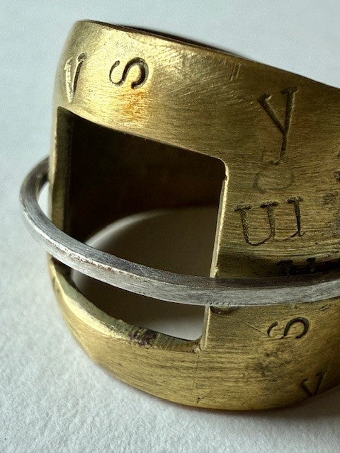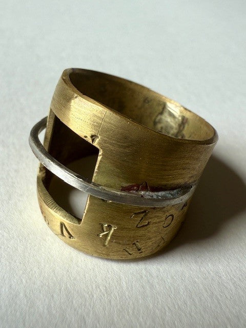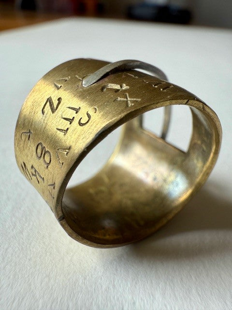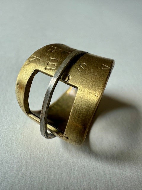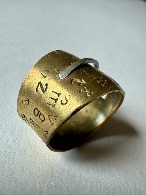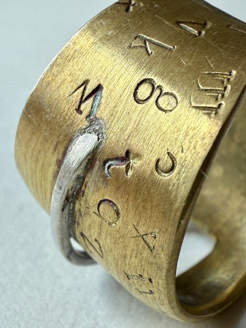 Hand-forged brass ringband, with hand-poked lettering and silver lining.
