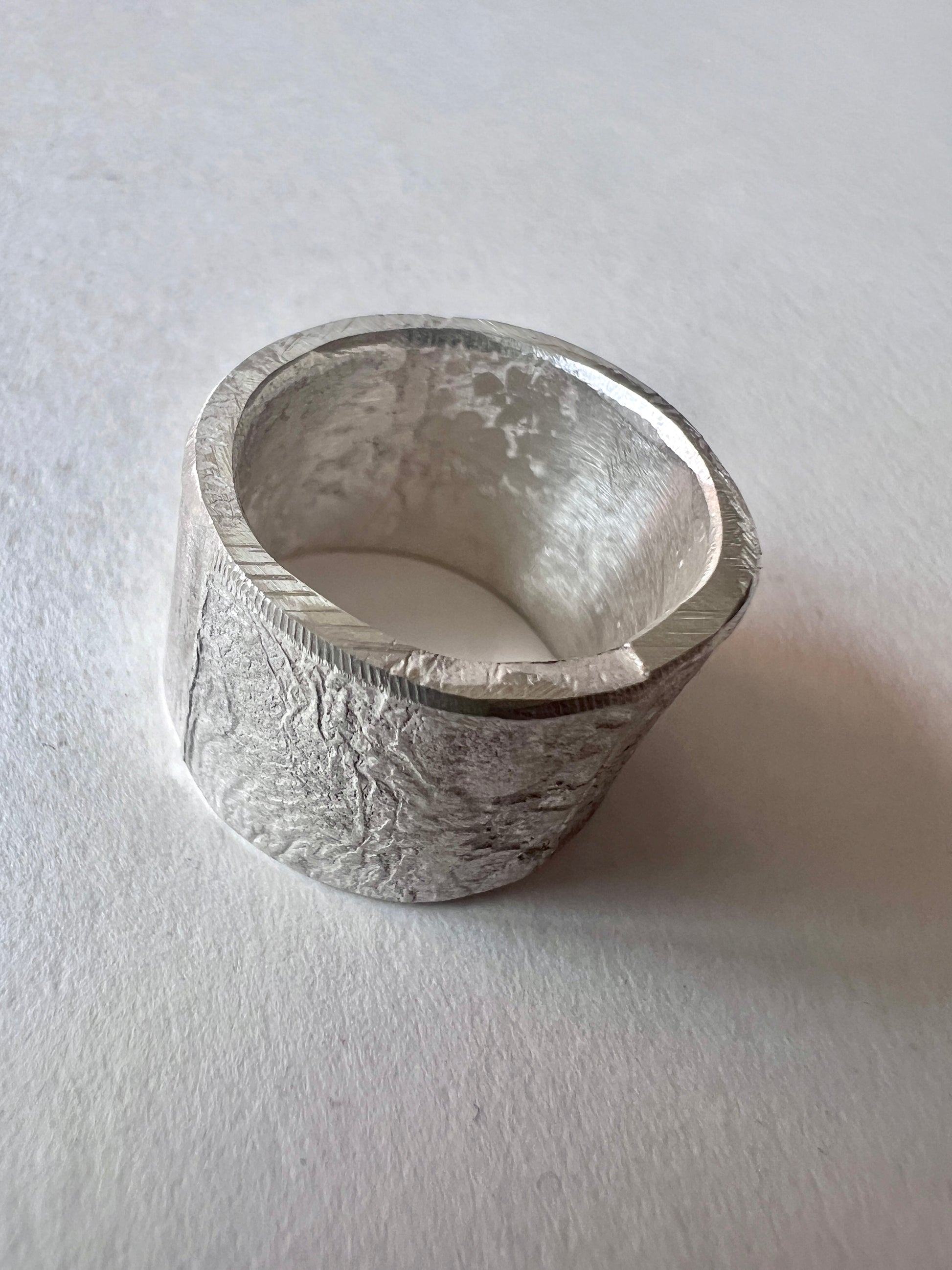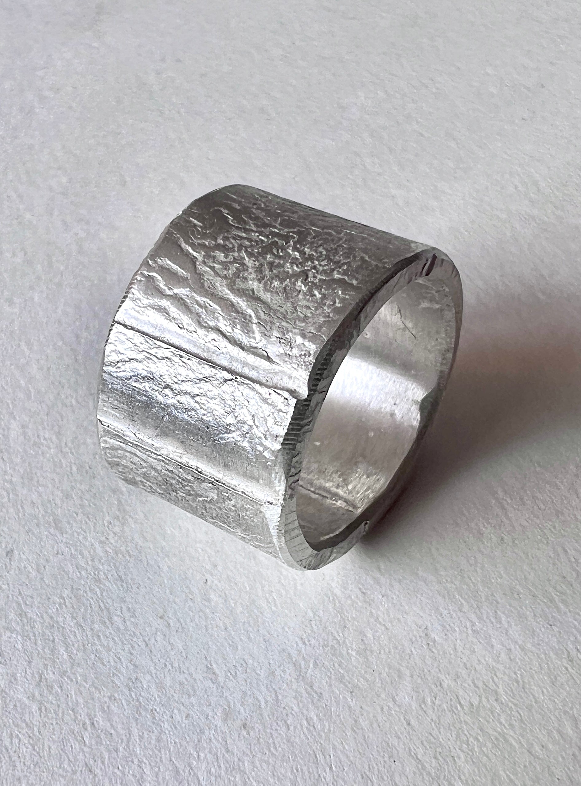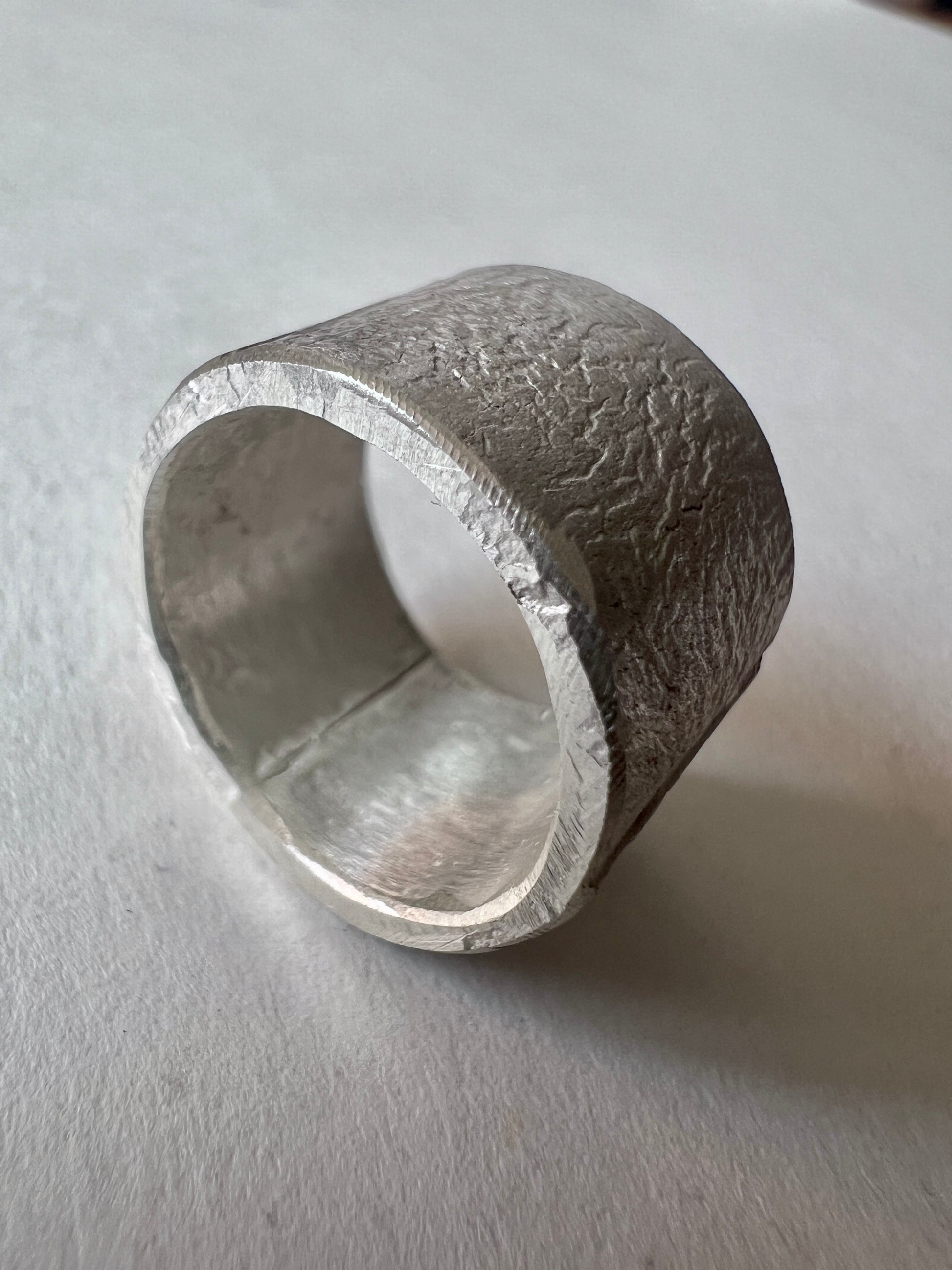 Solid silver hand-forged silver ringband, touched and textured by fire.