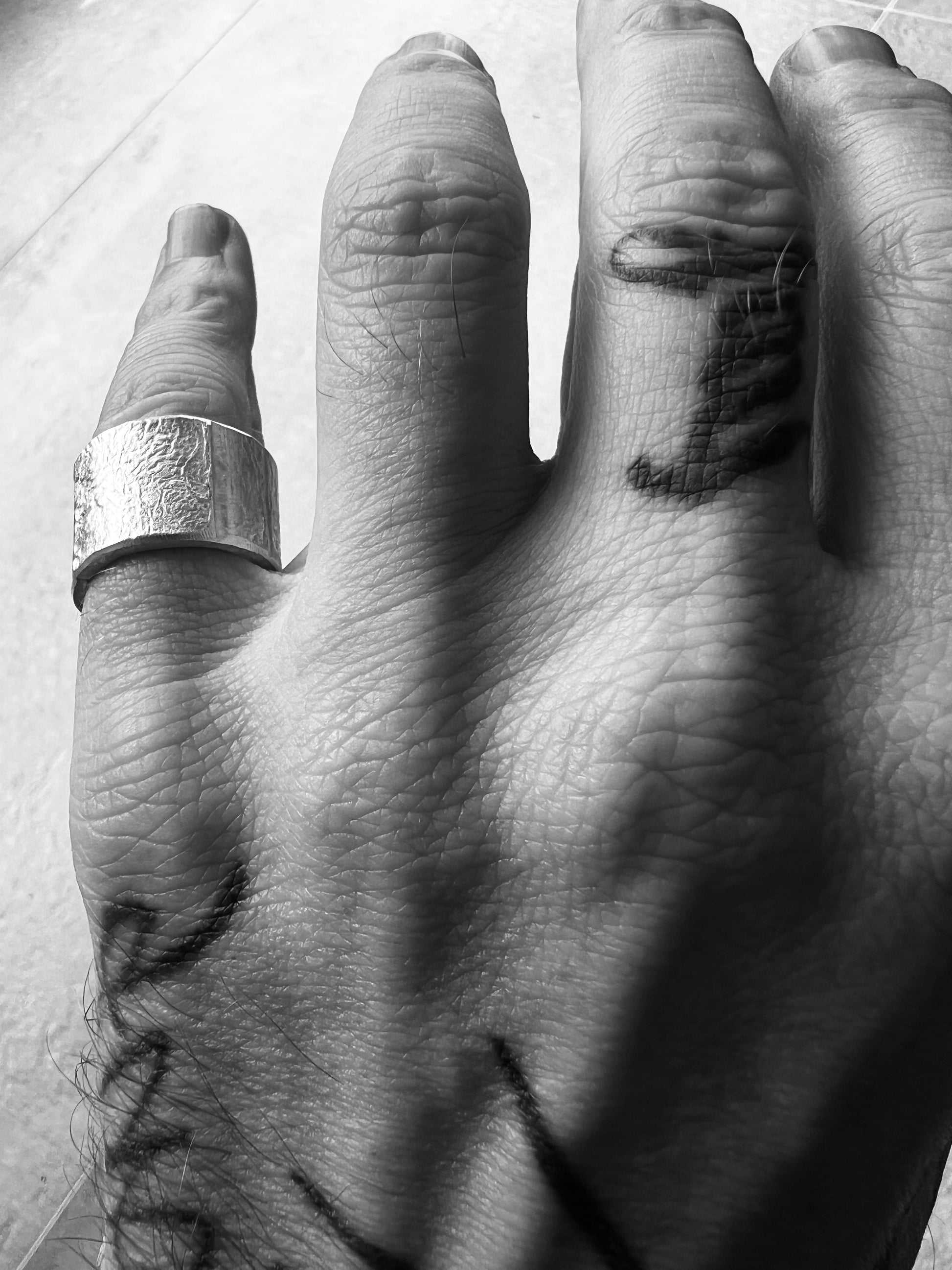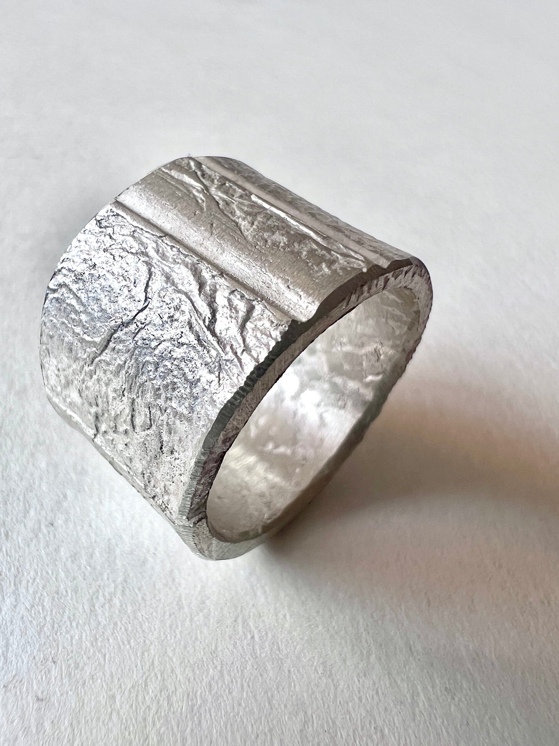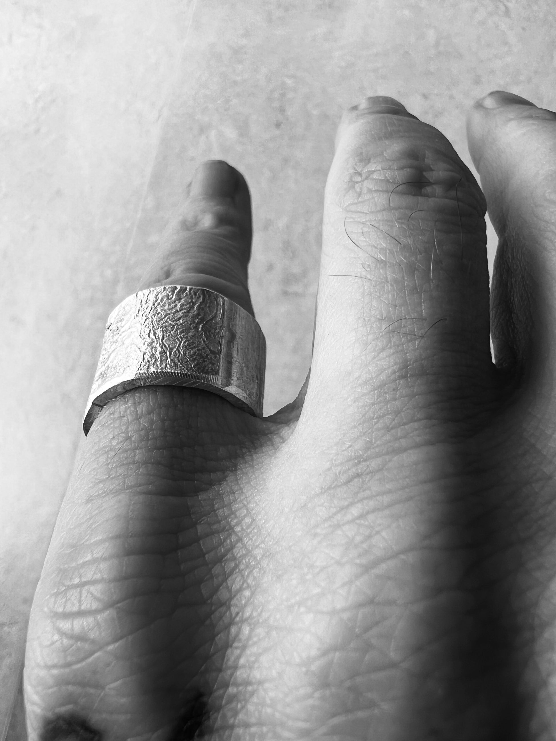 Solid silver hand-forged silver ringband, touched and textured by fire.